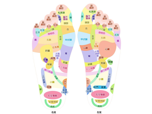 足の反射区は全身にある「ツボ」と同じ考え方で、足裏・甲・ふくらはぎ・膝上に至るまで、あらゆる臓器・関節・リンパ節に繋がっています。